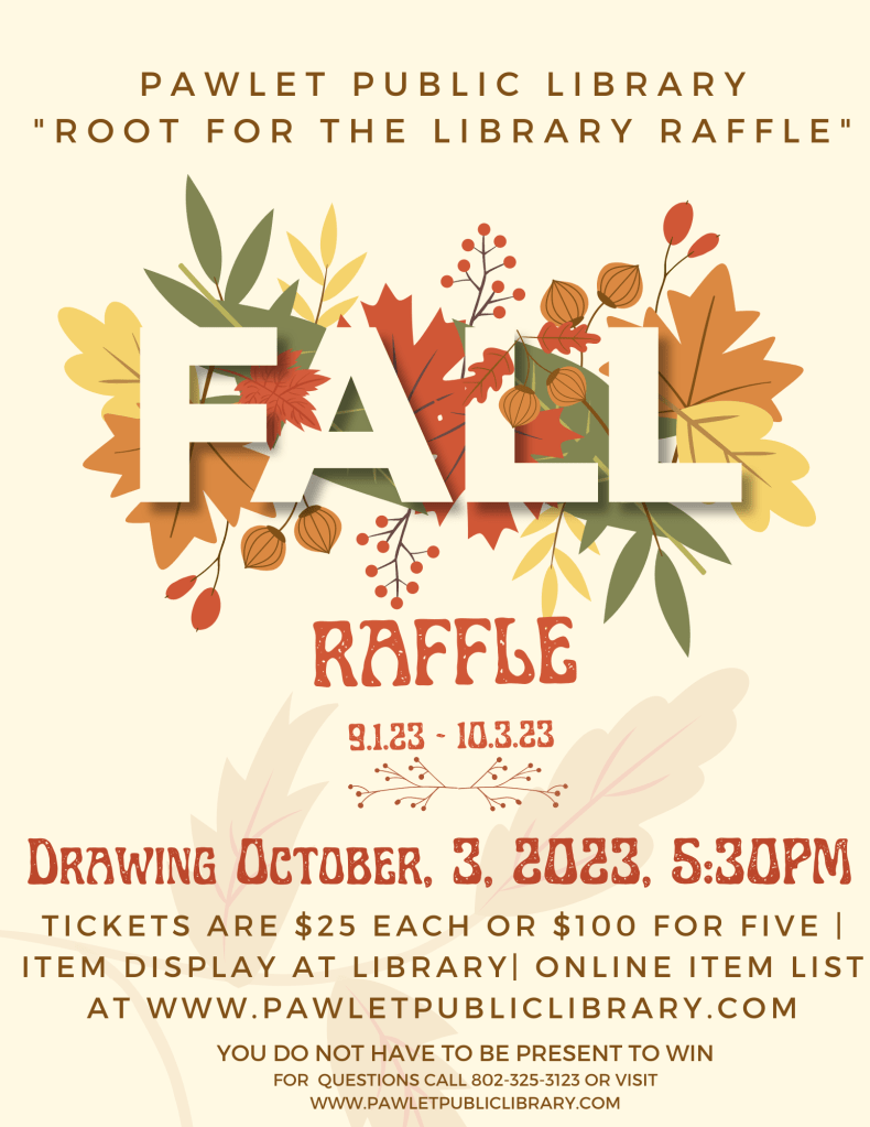 The Library Board invites you to help us make a difference in our community with our fall fundraiser, “Root for the Library Raffle.” You can browse our complete raffle item list here or pop into the library to see them on display. All of the items are valued at $100 or more. A preview list can be found on the back of this letter to whet your appetite! Raffle tickets are $25 each or $100 for five. You can choose which item each ticket is for, or simply take your chances.