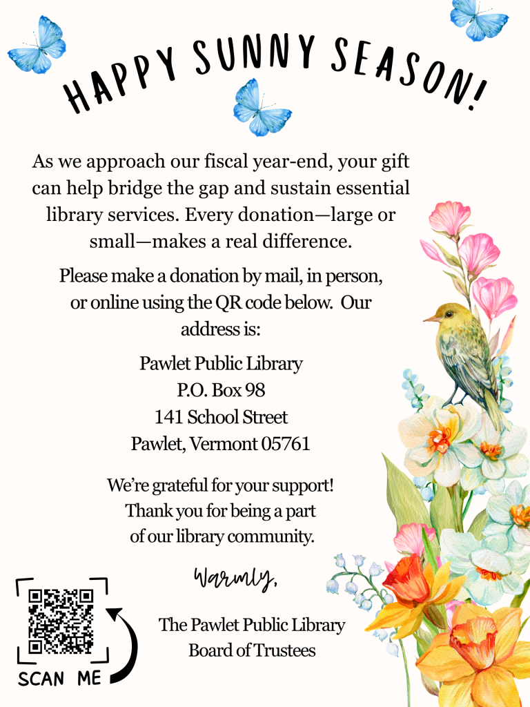 The library is currently not accepting donations of books for the 2026 book sale. Thanks to those who have donated so far!