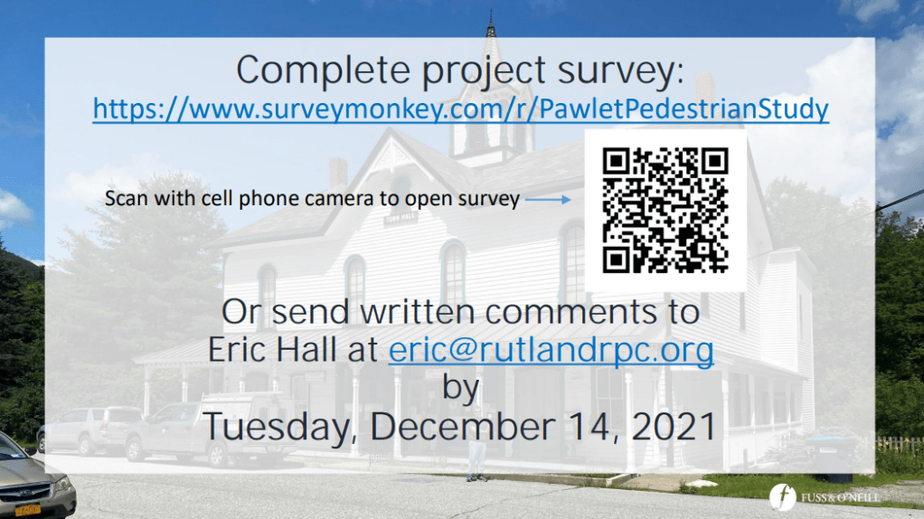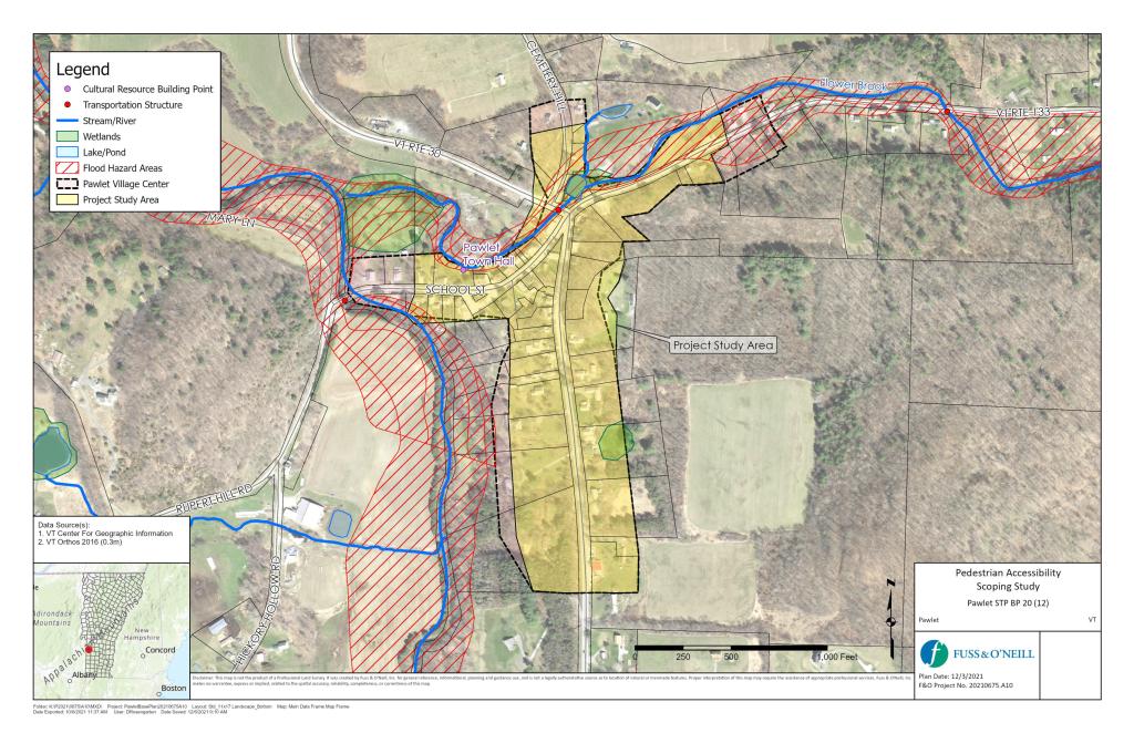 The Rutland Regional Planning Commission (RRPC) and the Town of Pawlet, in conjunction with the Vermont Agency of Transportation, have begun a Scoping Study, for pedestrian improvements along VT Route 30 from Sheldon’s Market to the U.S. Post Office, along Church St. (VT Route 133) and School St. from the Pawlet Community Church to the Pawlet Public Library, and the intersection of VT Route 30, Church St. (VT Route 133) and School St.