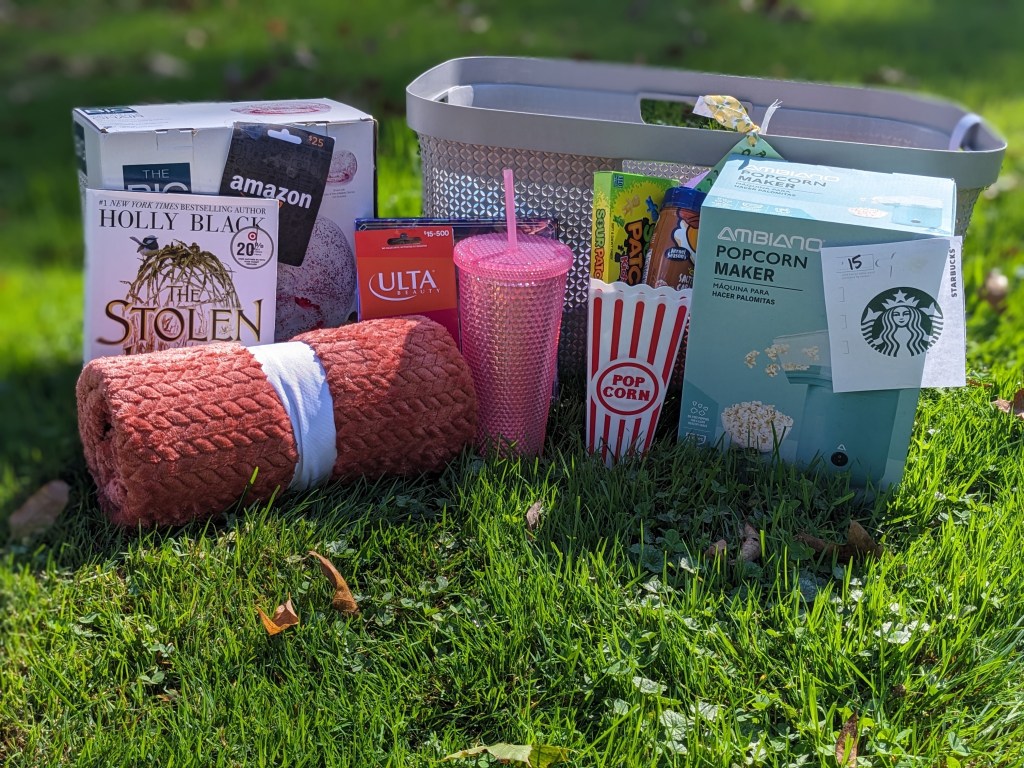 This basket was made with the modern teenager in mind! Celebrate this unique season in your life / or your loved one’s life by bidding on this basket. It includes one popcorn topper, a fiction novel, blow up sparkle chair, fall blanket, makeup brush set, Starbucks cup, Ulta gift card, candy holders, and Amazon gift card. Snuggle up in style this fall!